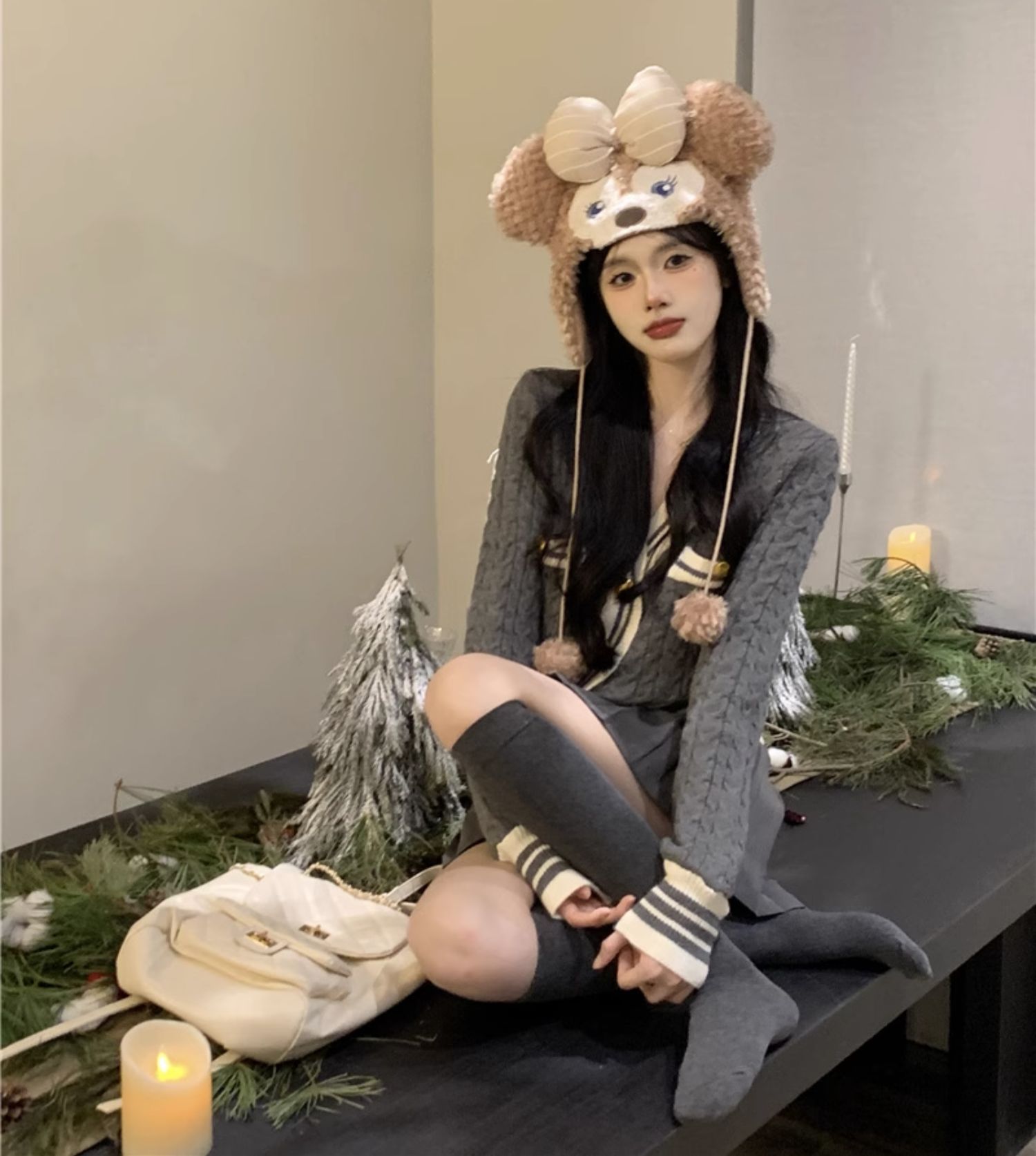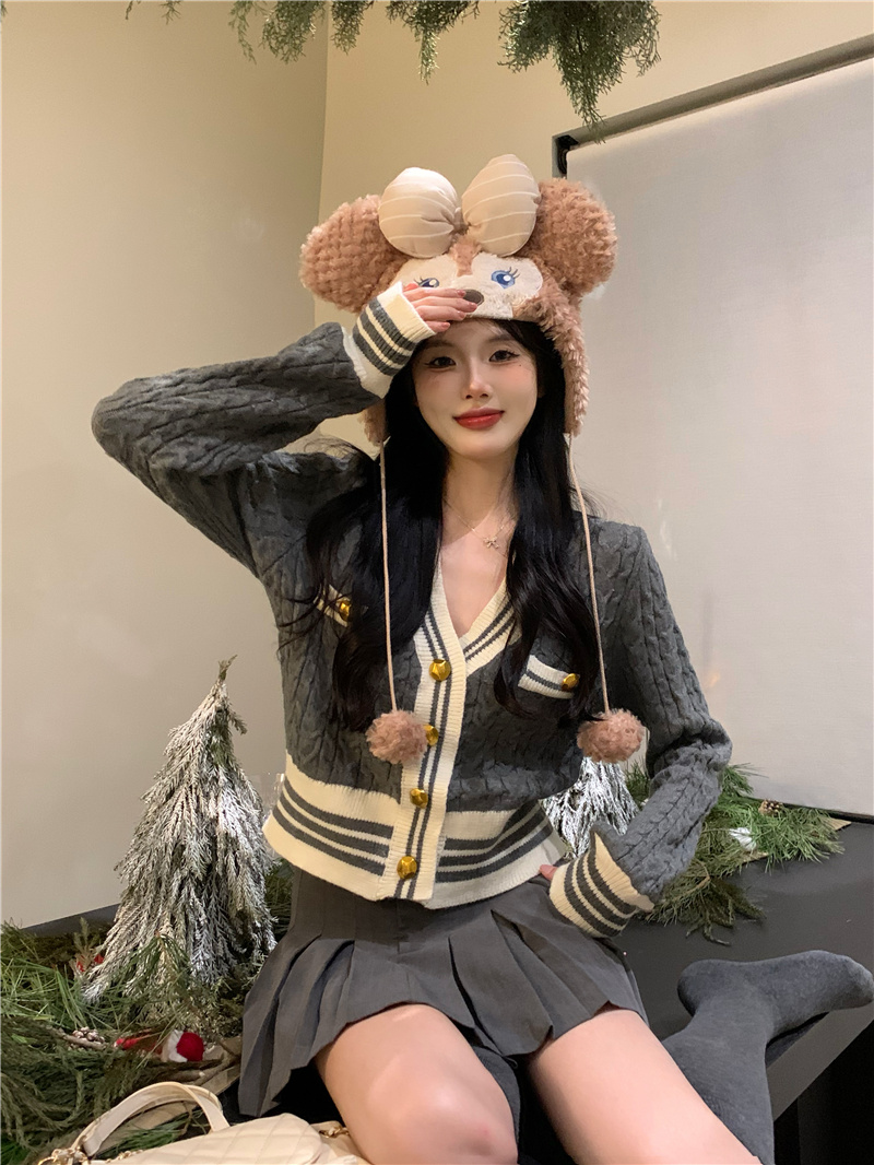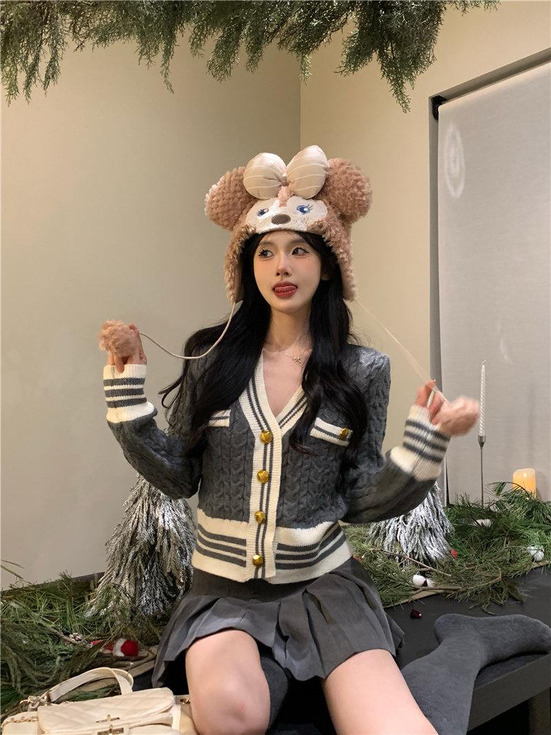 韩版灰色小香风麻花针织开衫女v领毛衣新款外套短款长袖上衣秋季的描述