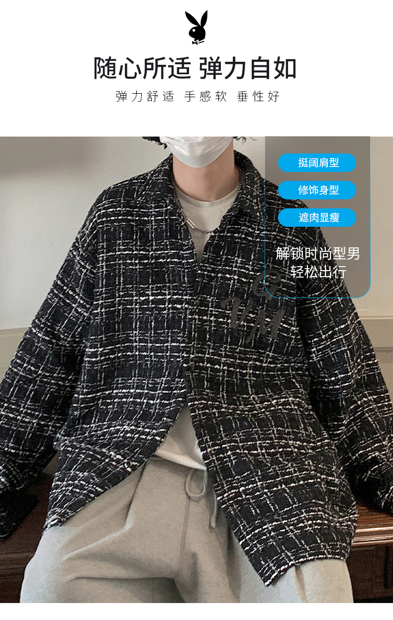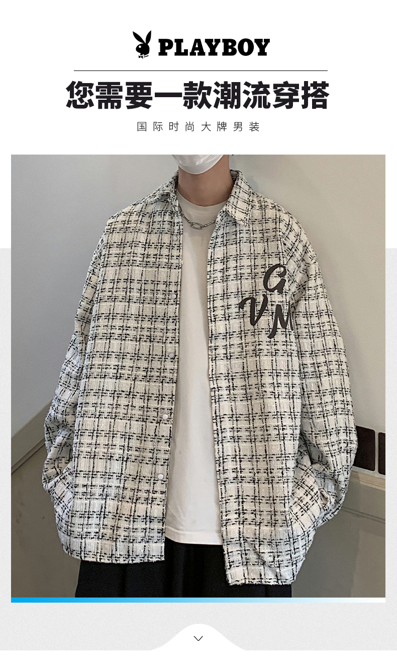花花公子长袖衬衫男2023秋季潮牌宽松翻领衬衣男士休闲格子上衣服的描述