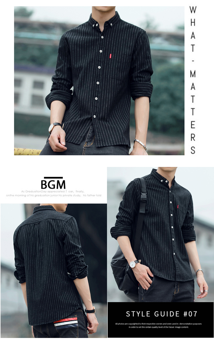 秋季条纹磨毛宽松棉衬衣男士上衣服长袖衬衫大码休闲男装外套潮流