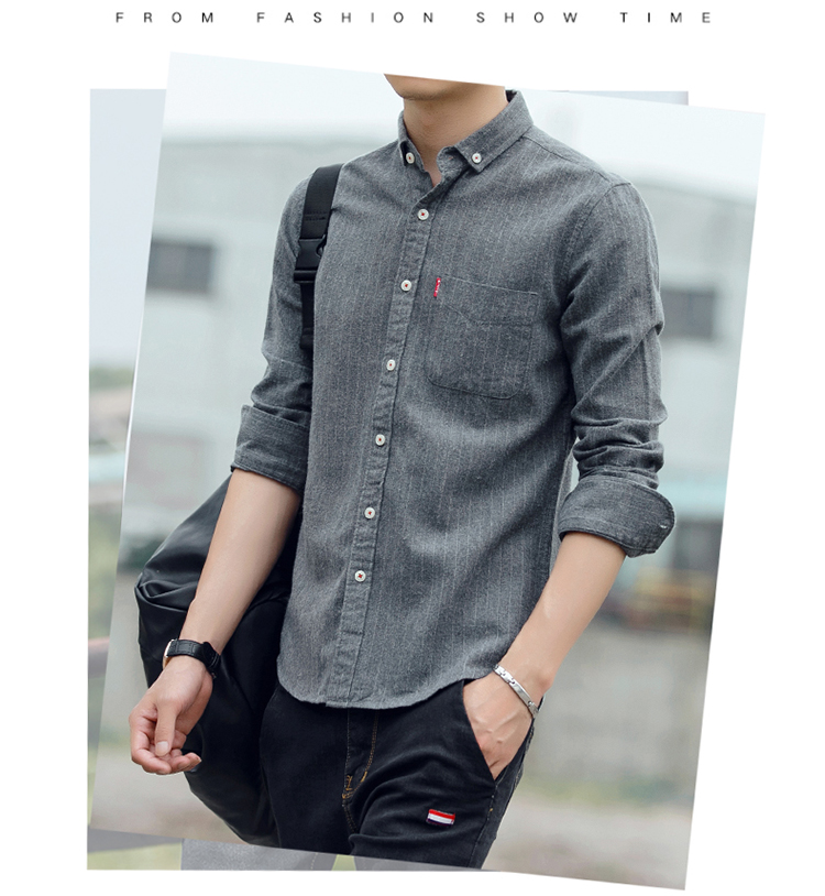 秋季条纹磨毛宽松棉衬衣男士上衣服长袖衬衫大码休闲男装外套潮流
